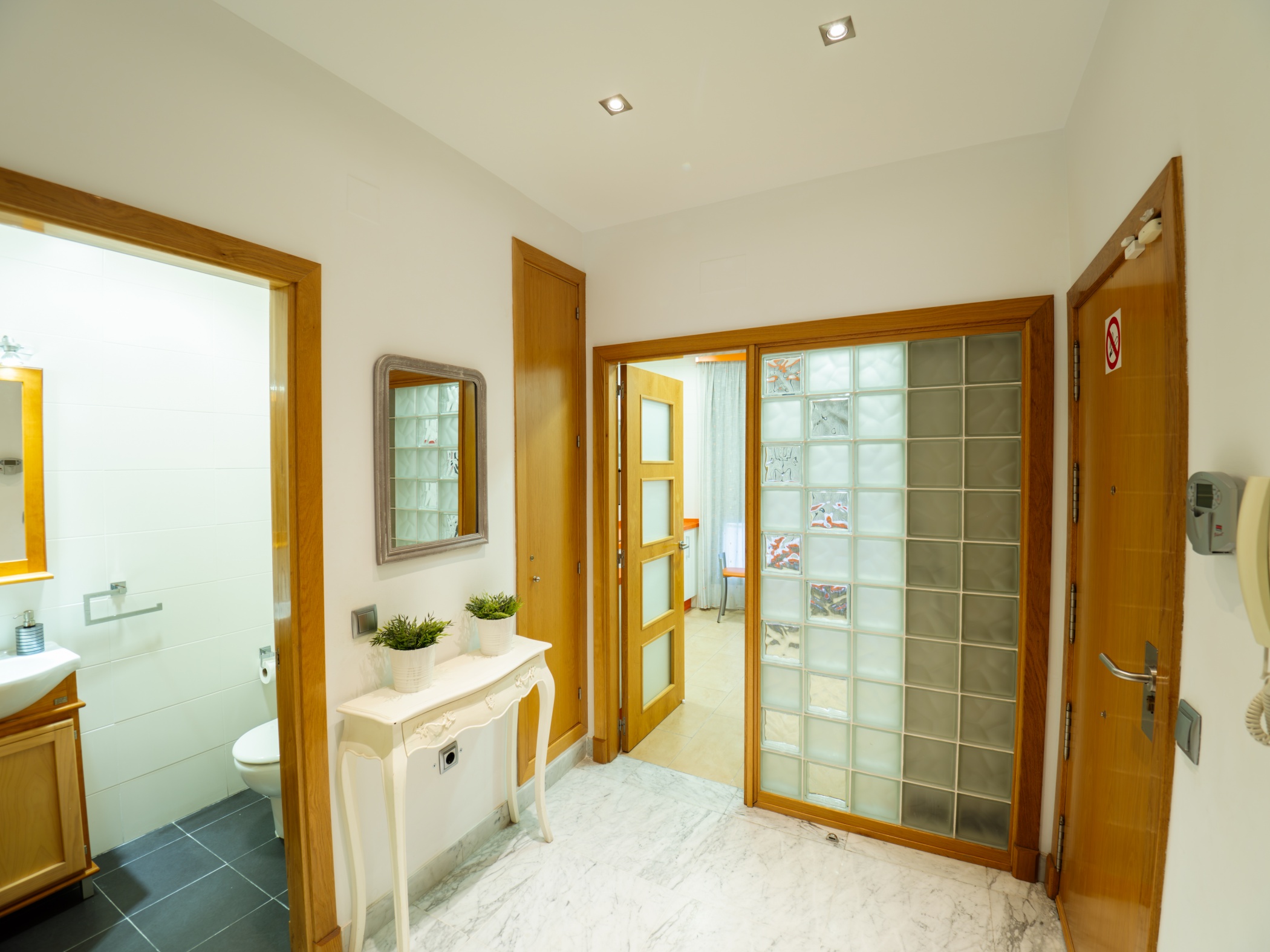 Español. Por favor, diríjanse al punto de encuentro para que podamos vernos. Es muy importante que nos avisen 30 minutos antes de su llegada. Estaremos allí para atenderles. Si han reservado el parking privado, les guiaremos hasta la entrada que se encuentra en el mismo edificio del apartamento.